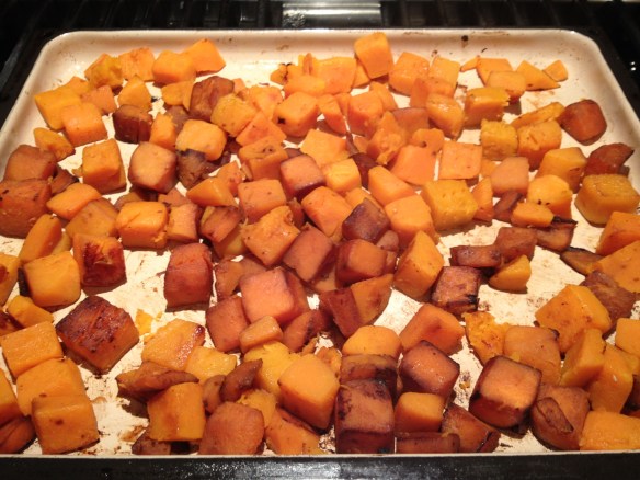 - Peel and dice butternut squash (or open package of pre-diced squash), and put on a lightly sprayed roasting pan. Lightly spray squash and lightly sprinkle salt. Top with a light dusting of cinnamon.