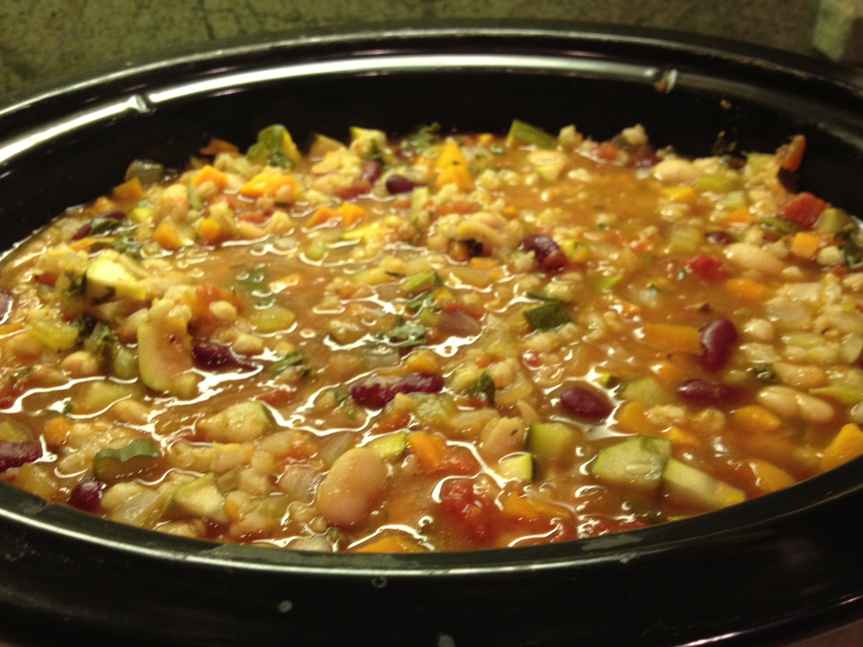 Consistent with my goal of serving one vegetarian meal a week, tonight’s meal was Vegetarian Minestrone. Because it is a crock pot recipe I was able to prepare the soup earlier in the day.  I got all the ingredients in the crock pot and turned it on at 2:45 so it was ready around 6:00. As I learned from Simple Gourmet Chef Melanie Barsuk, crock pot recipes can “cook out” and lose their flavor.  This is a simple soup with simple flavors.  Don’t over cook it…