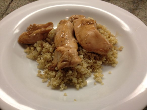7. When Chicken is ready (clear juices when cut, and meat springs back to the touch), portion on plate with quinoa.