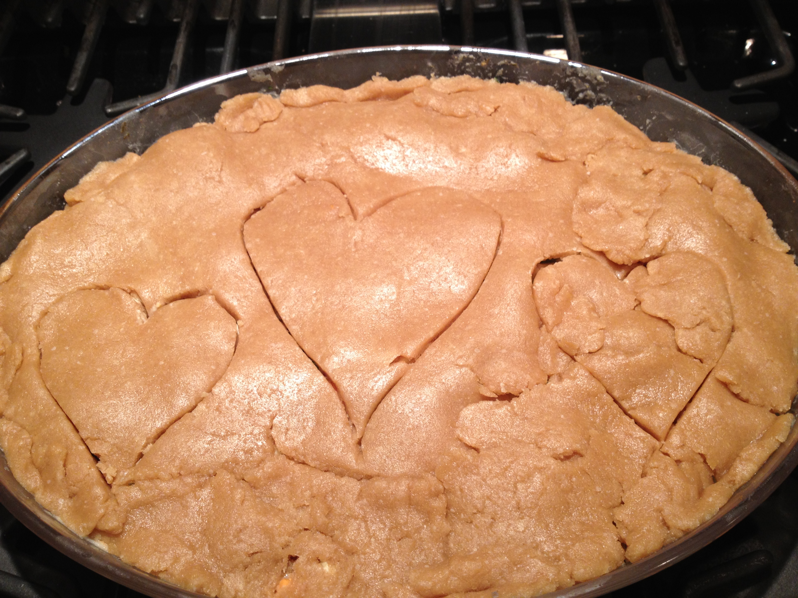 9.  Unroll pie dough. Cut small slits (or a heart design for Valentine’s Day) into center of dough to allow steam to escape.