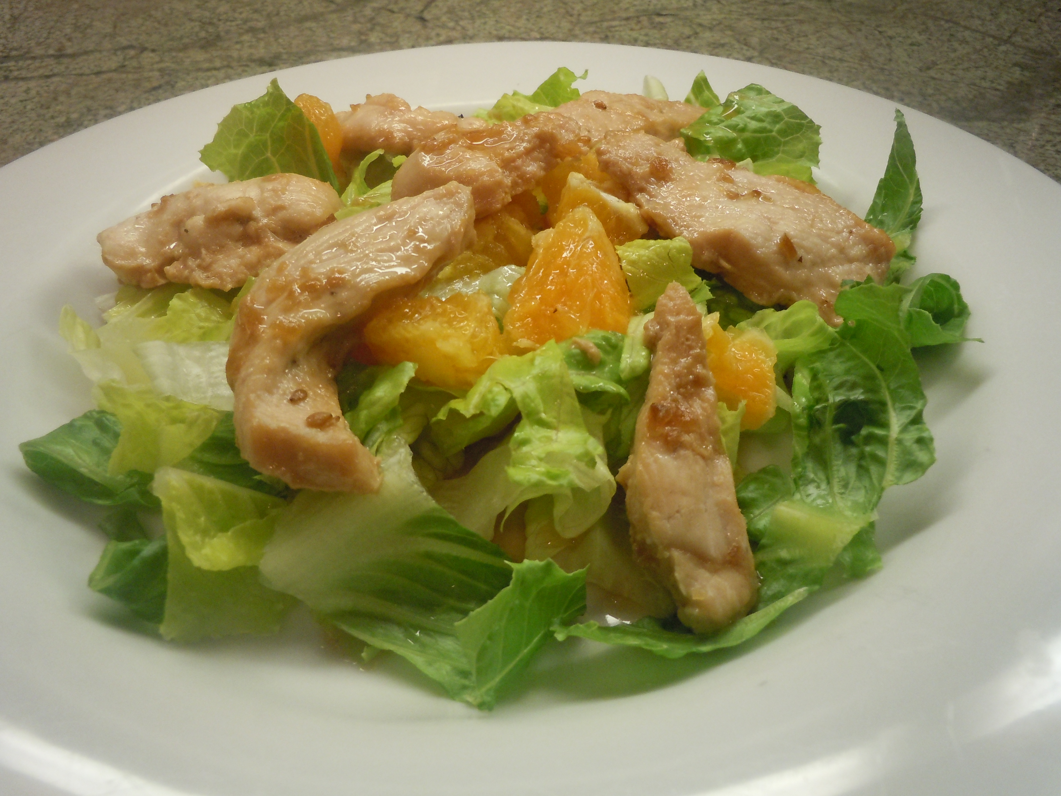 - Build the salad, beginning with a portion of greens, topping with oranges, green onion, tomato, and chicken.