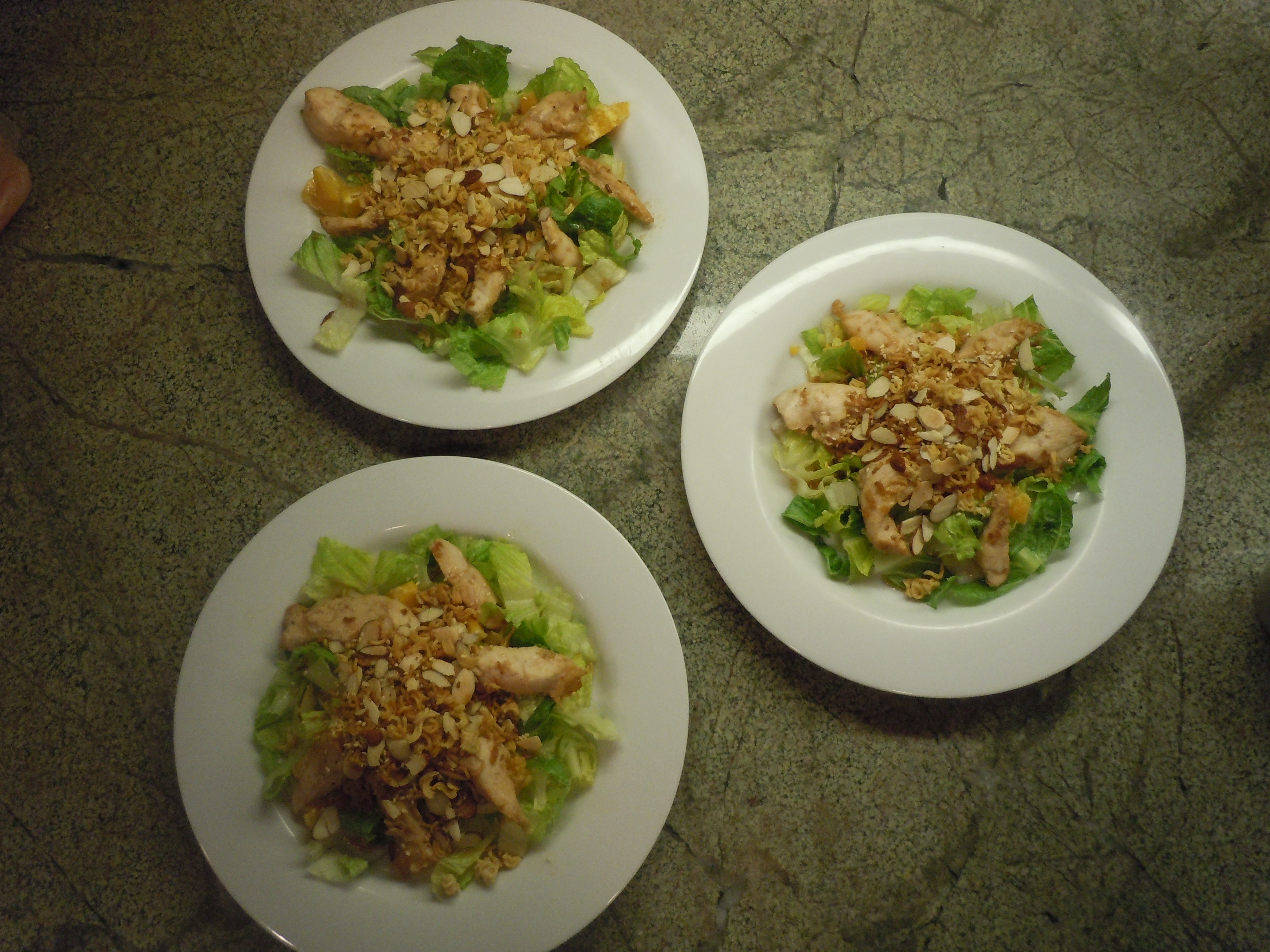 Once the chicken is done, it is time to build the salad. First portion greens on each plate. Then add some cut up oranges, green onions if you include them, and tomatoes, followed by chicken pieces. I usually arrange the chicken in a star because I think it looks appealing. (I have always thought that if food looks good, people (including kids), are more excited about trying it.) Then I poured a small amount of Chinese Chicken Salad dressing on top. Many are high in calories and fat so read labels when you choose your dressing, and go easy on the pouring. Lastly, top with the crunchies.