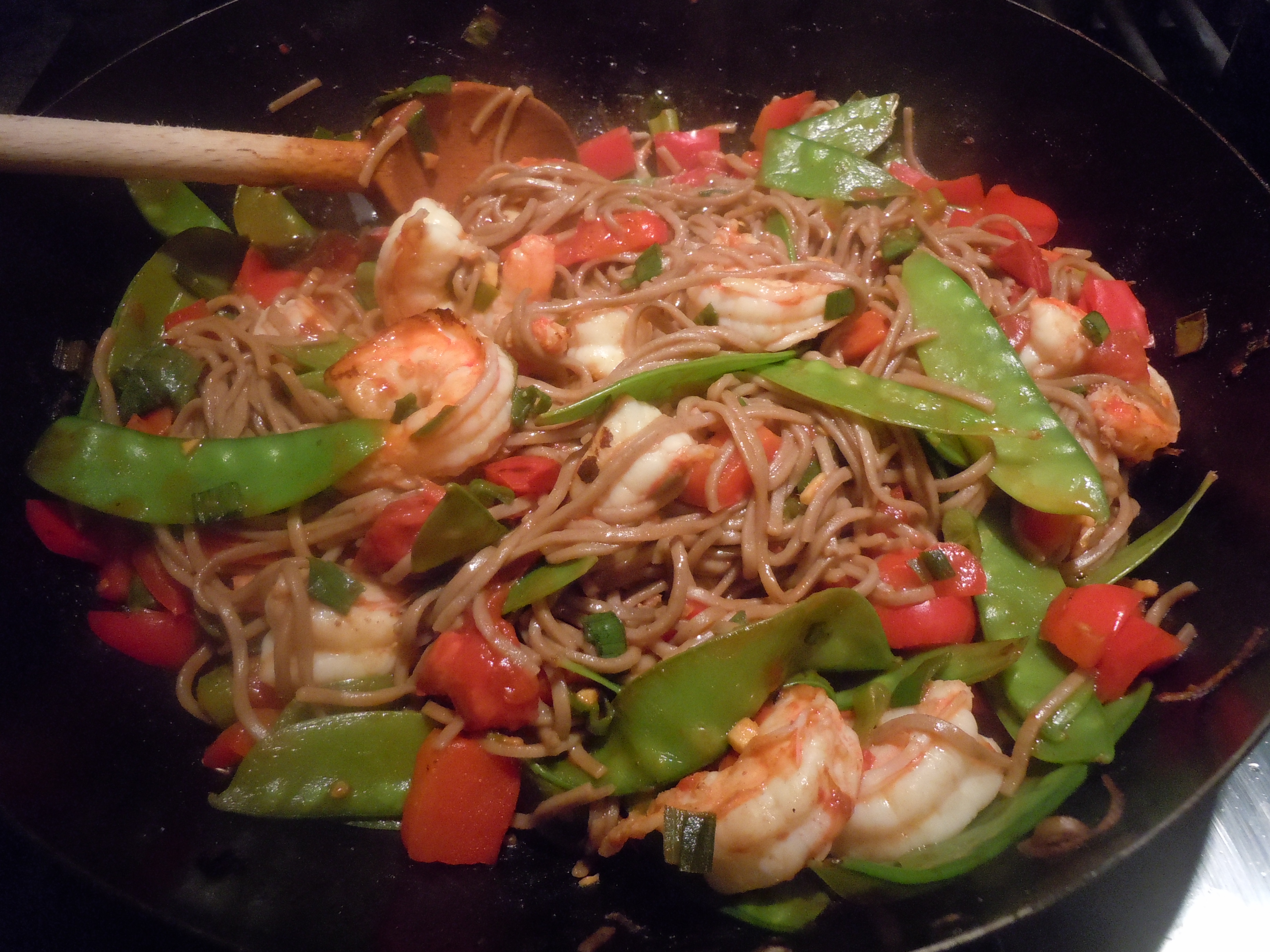 Tues: Shrimp stir fry with soba noodles, snow peas, pineapple, tomatoes, green onions, and garlic with Ginger- Hoisin sauce