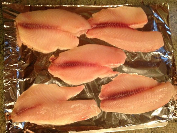 - Rinse tilapia and place on foil on top of a baking sheet.