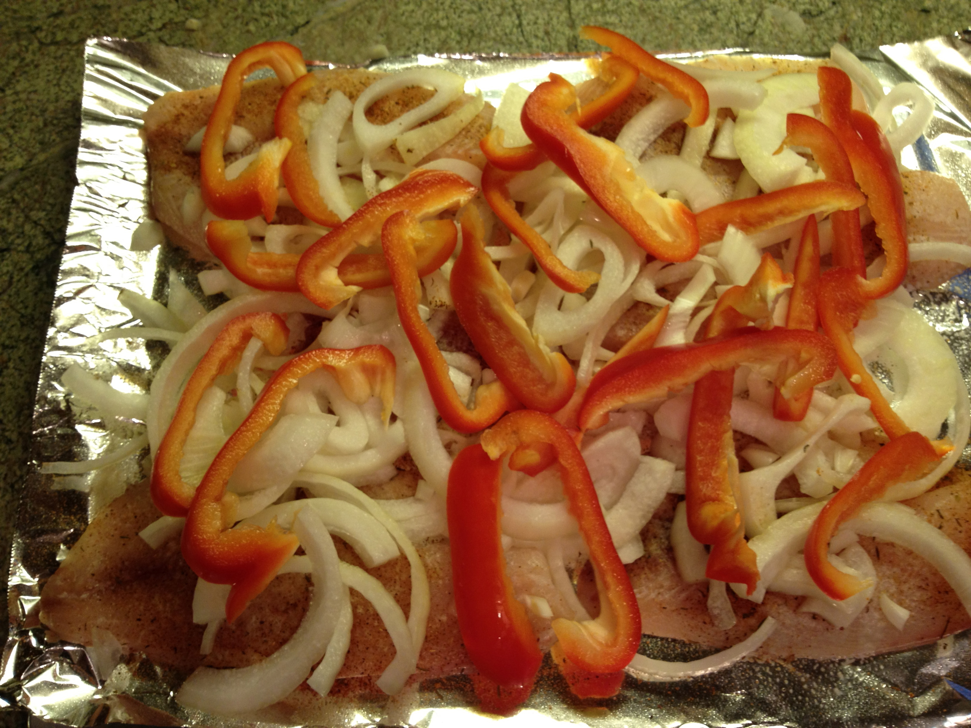 - Sprinkle Seafood Magic seasoning on tilapia and top with onions and red bell pepper.