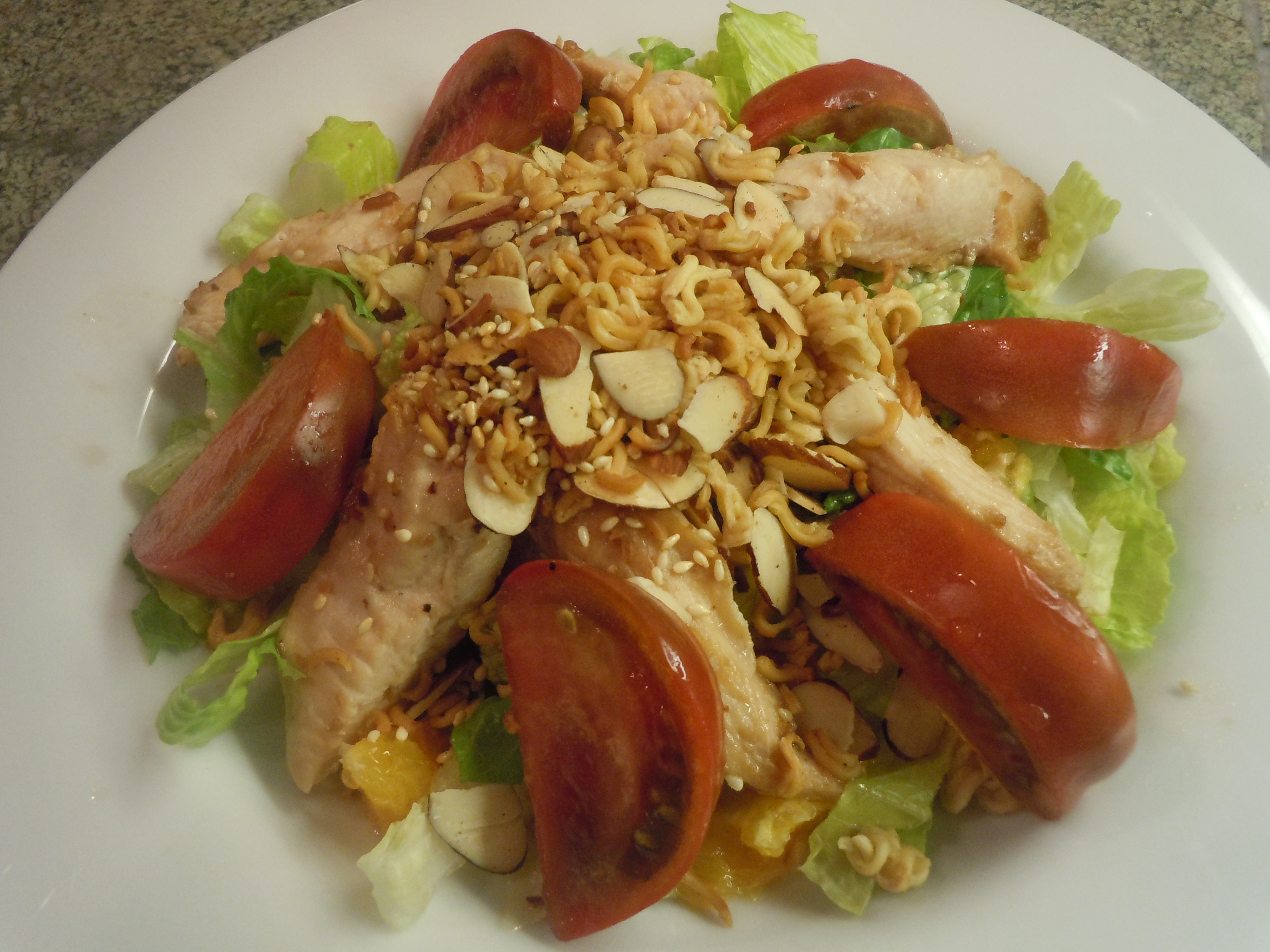 7. Build the salad, beginning with a portion of greens, topping with oranges, green onion, tomato, and chicken.