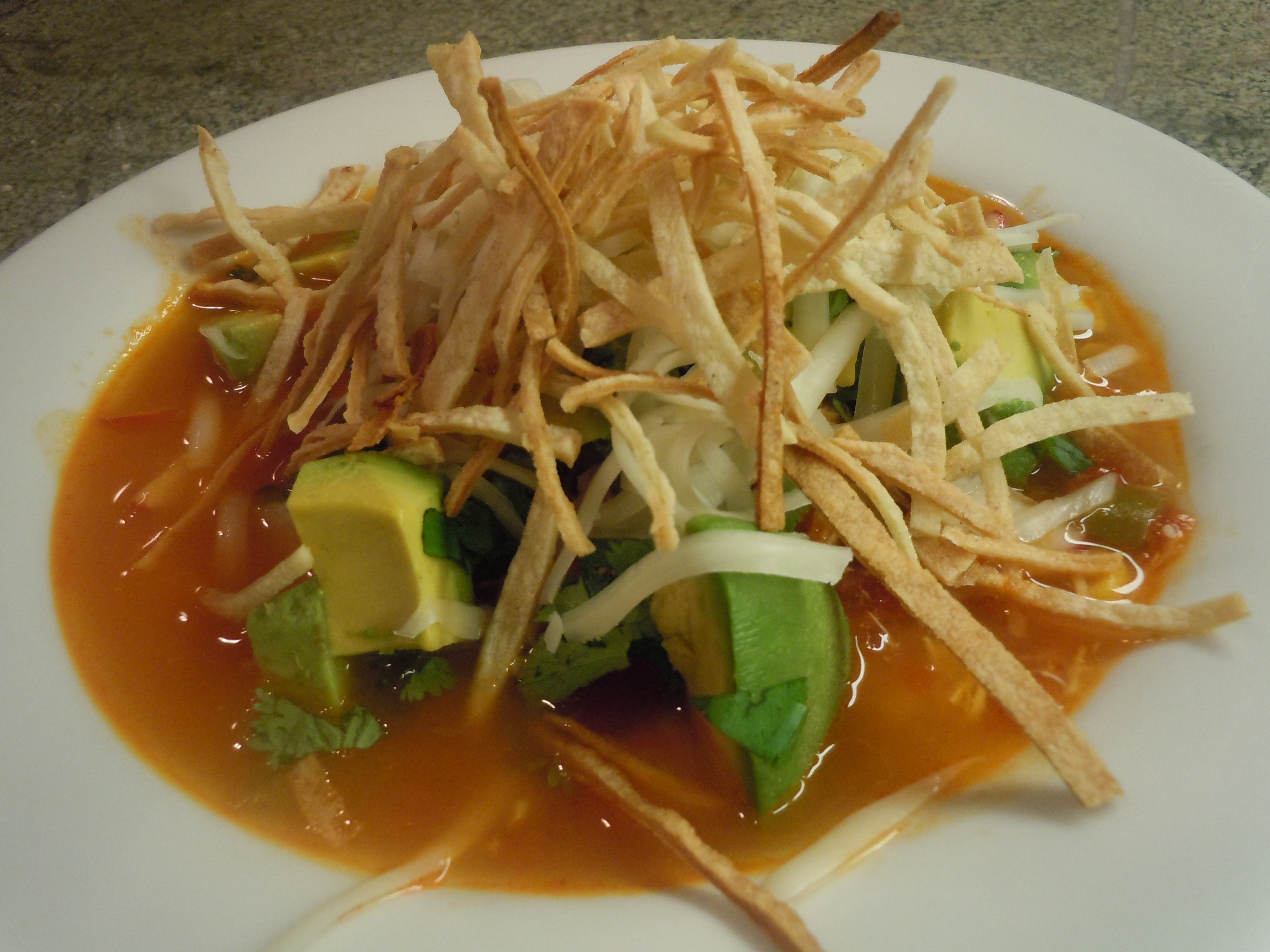 11.  Add the limejuice, stir, and serve, with cilantro, lime wedge, avocado, radishes (if you added these two items), and baked tortilla strips.
