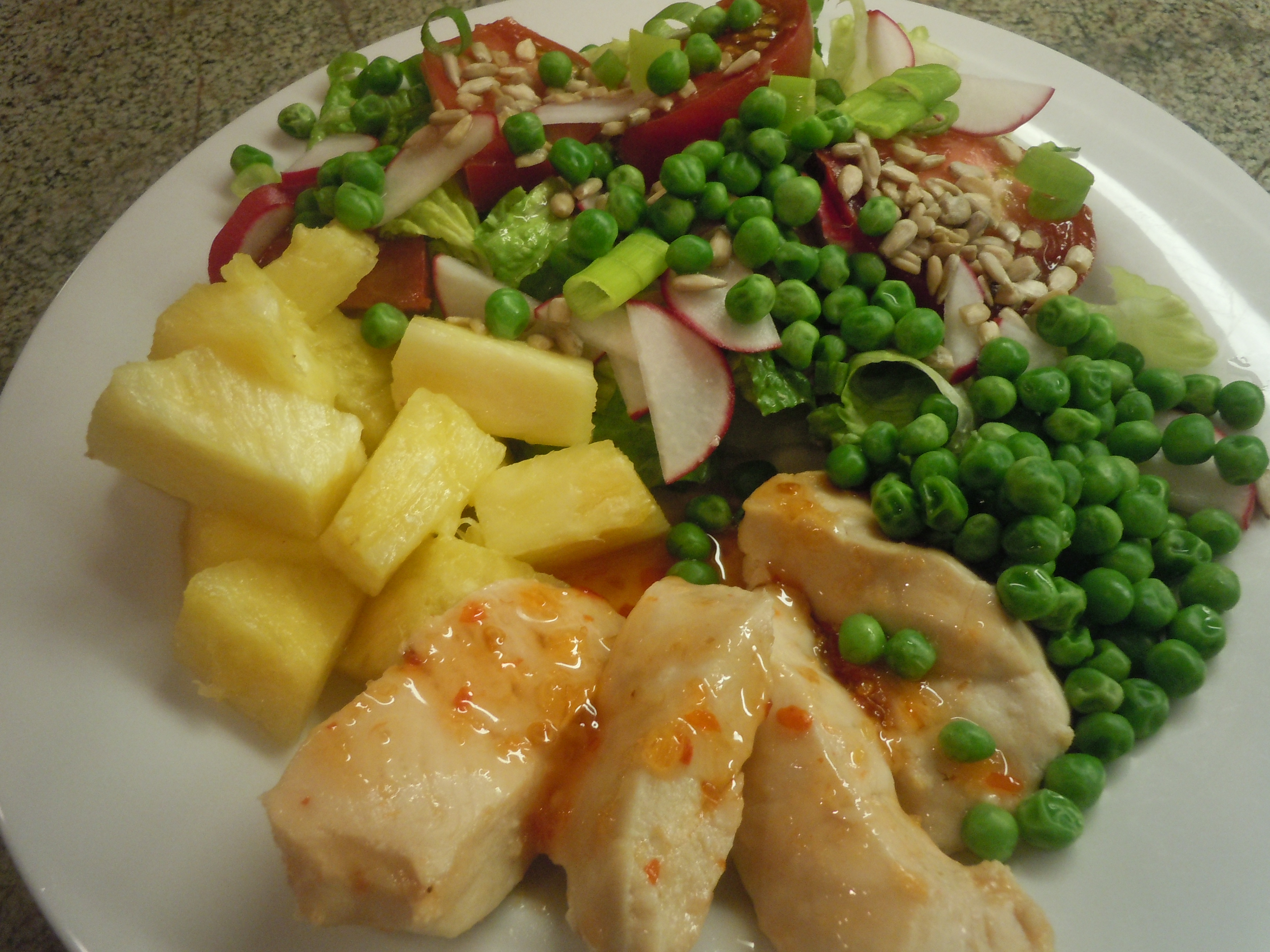 3. Cut pineapple, cook peas in microwave for 2-3 minutes, and make a small side salad with your choice of fixings.  I used sunflower seeds and thinly sliced radishes. Portion the sides on plates.