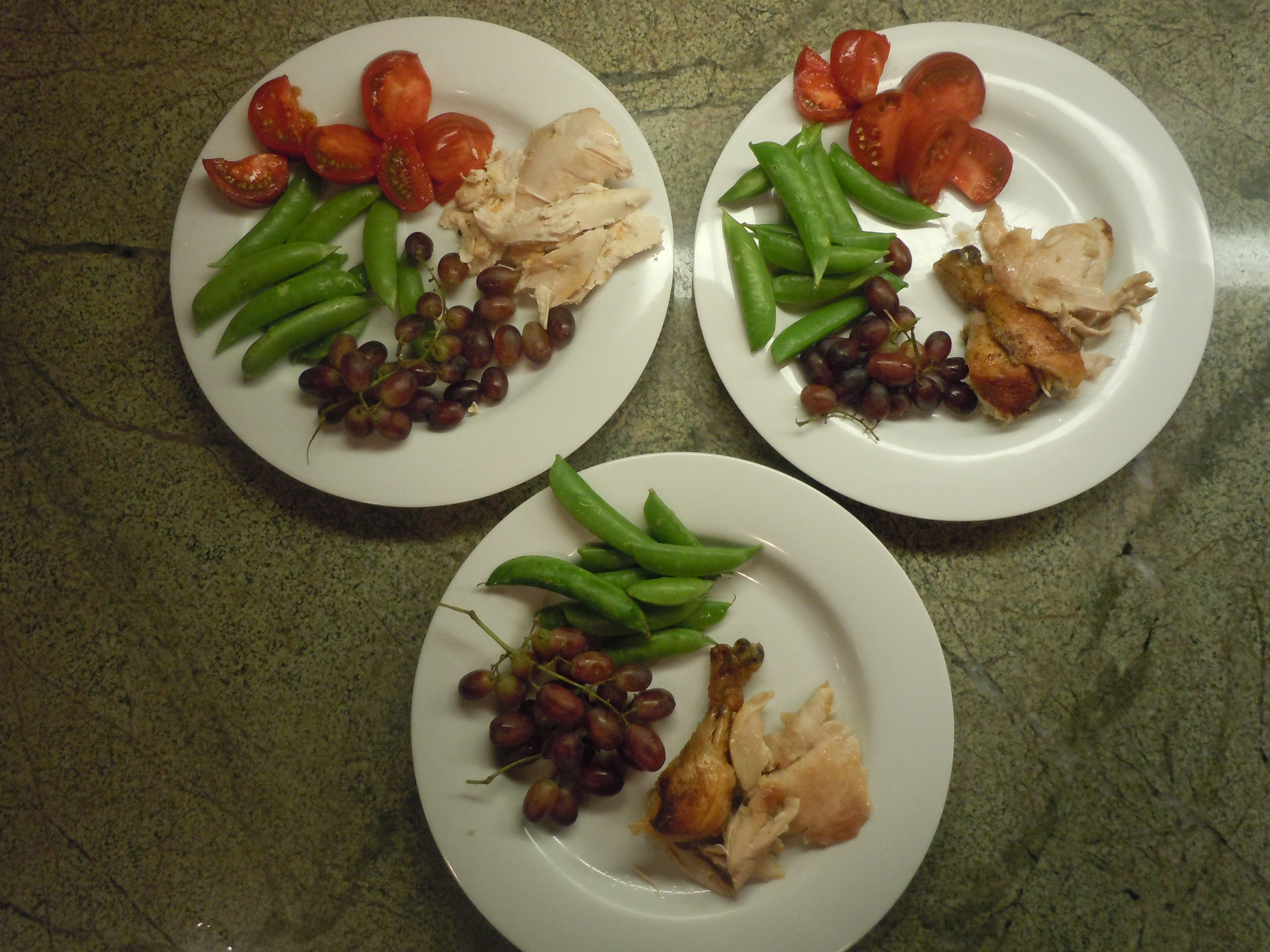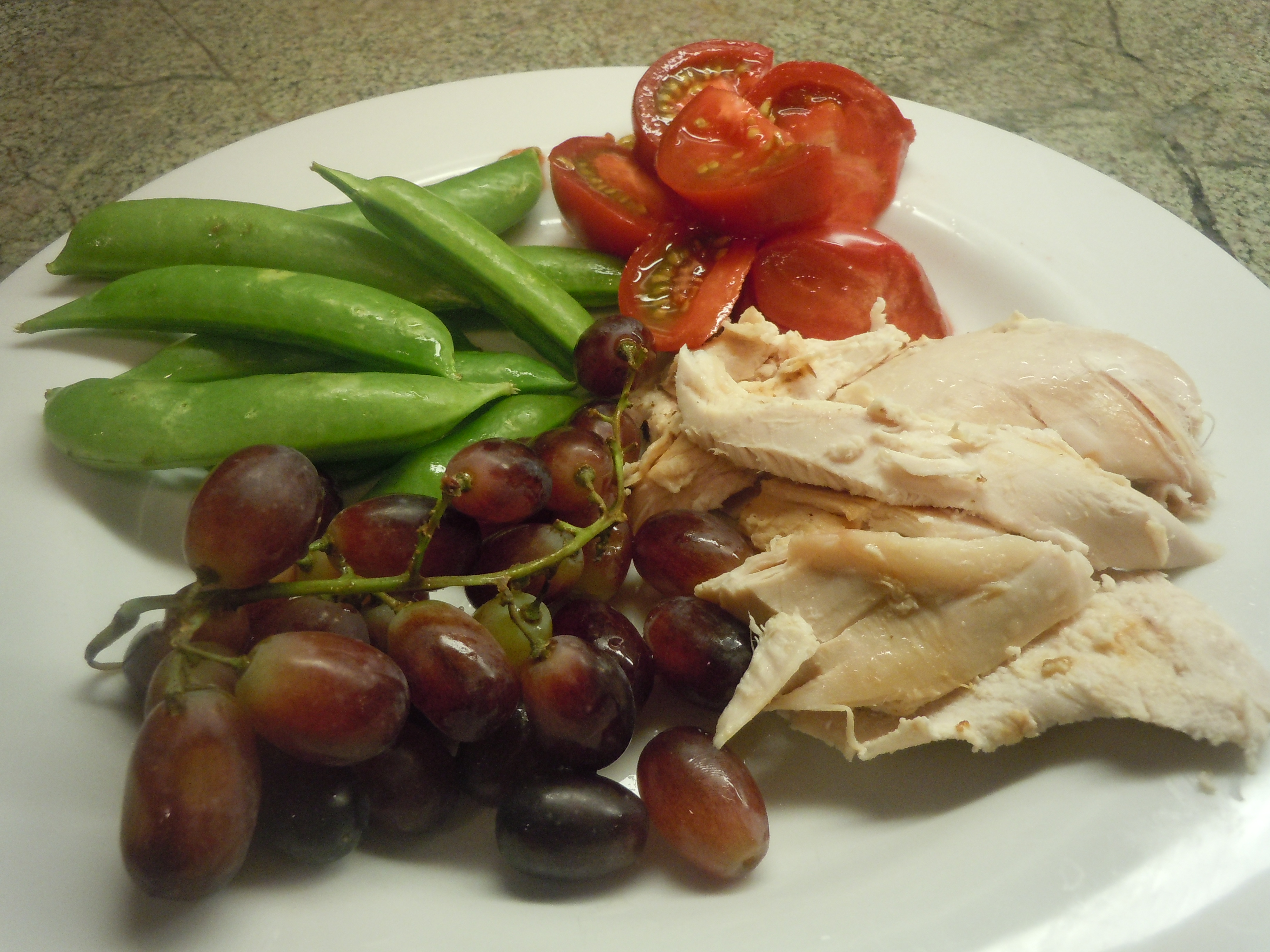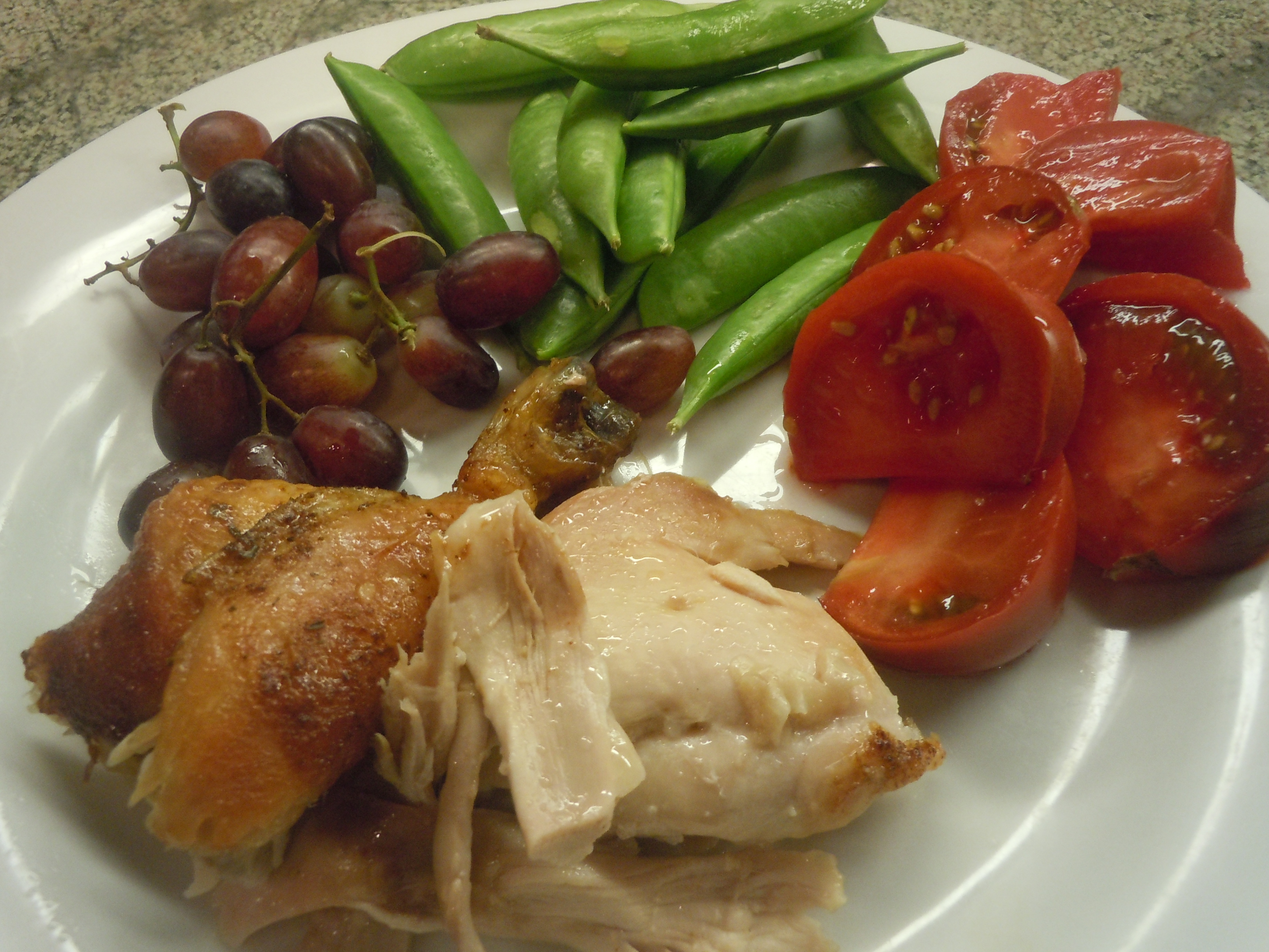 Recipe:  Baked chicken, Peas, Fruit, and Side Salad