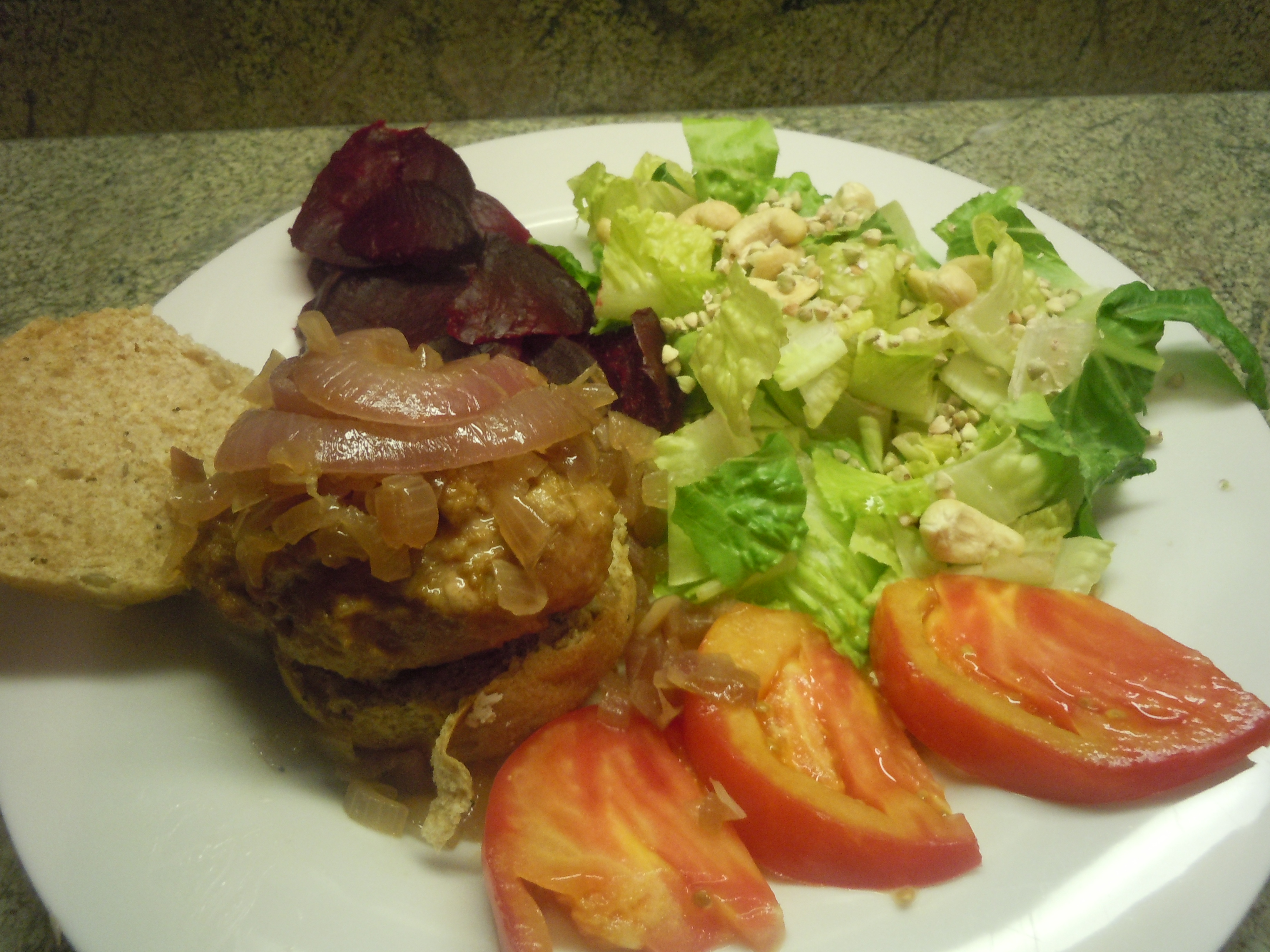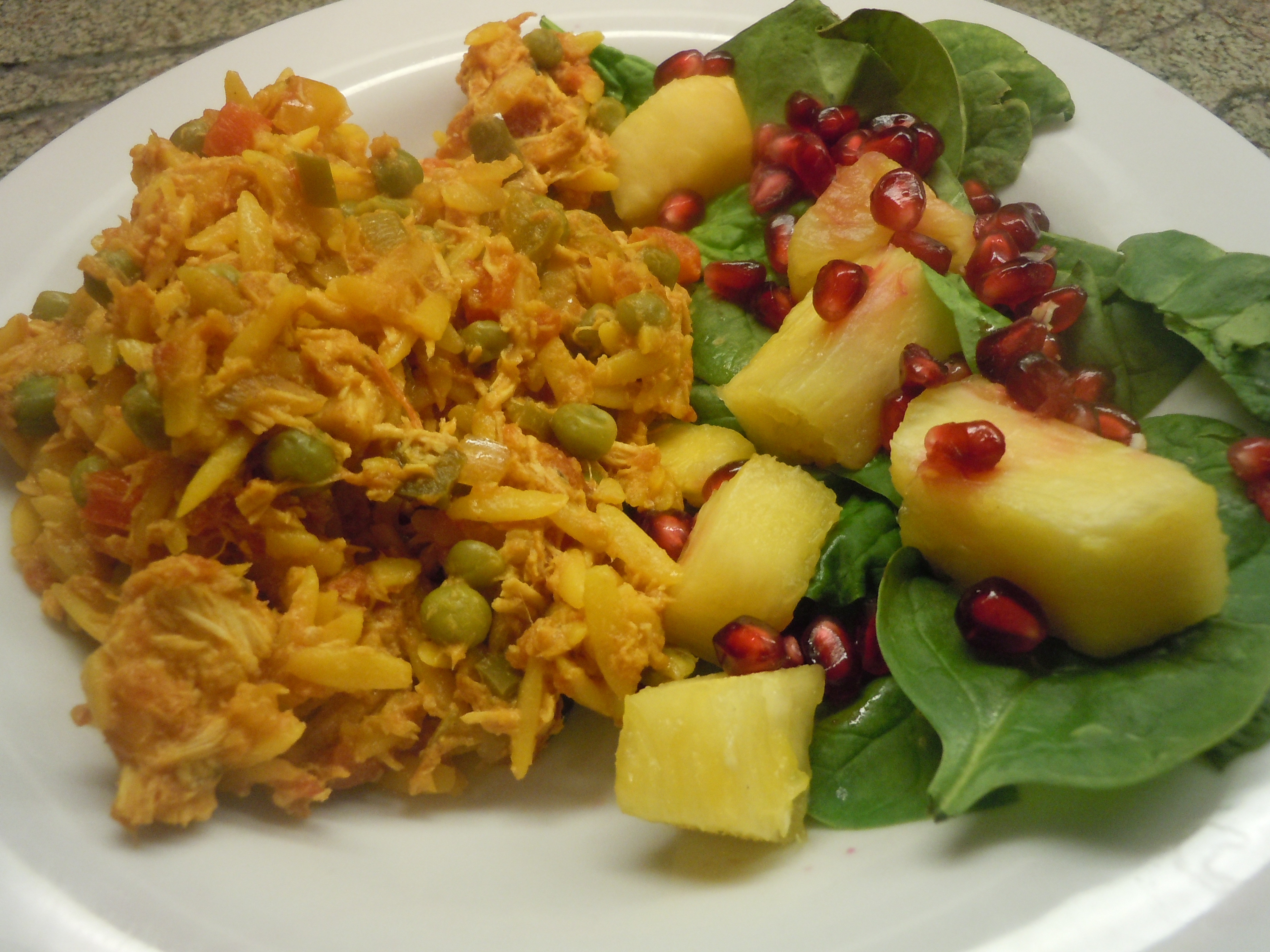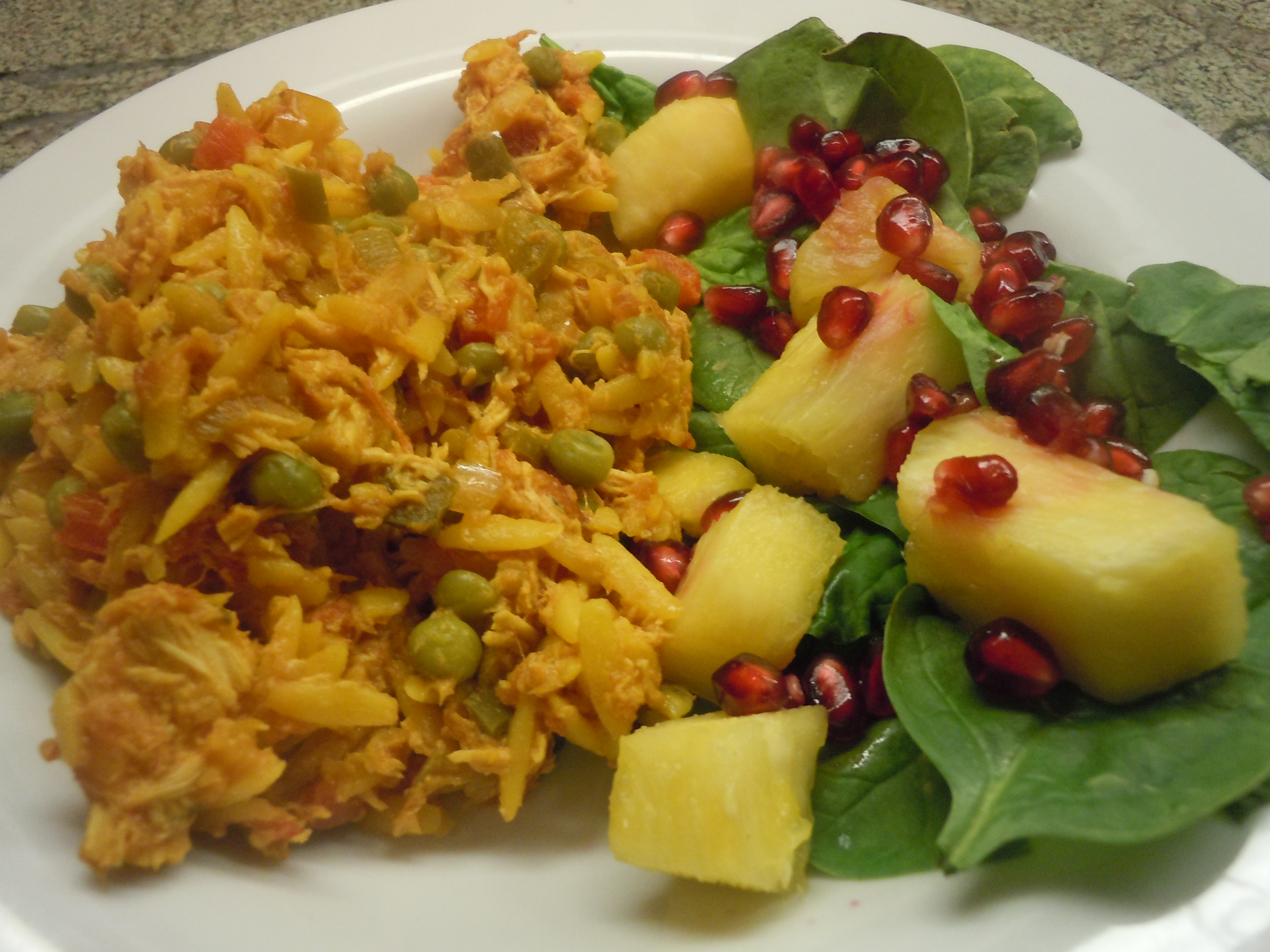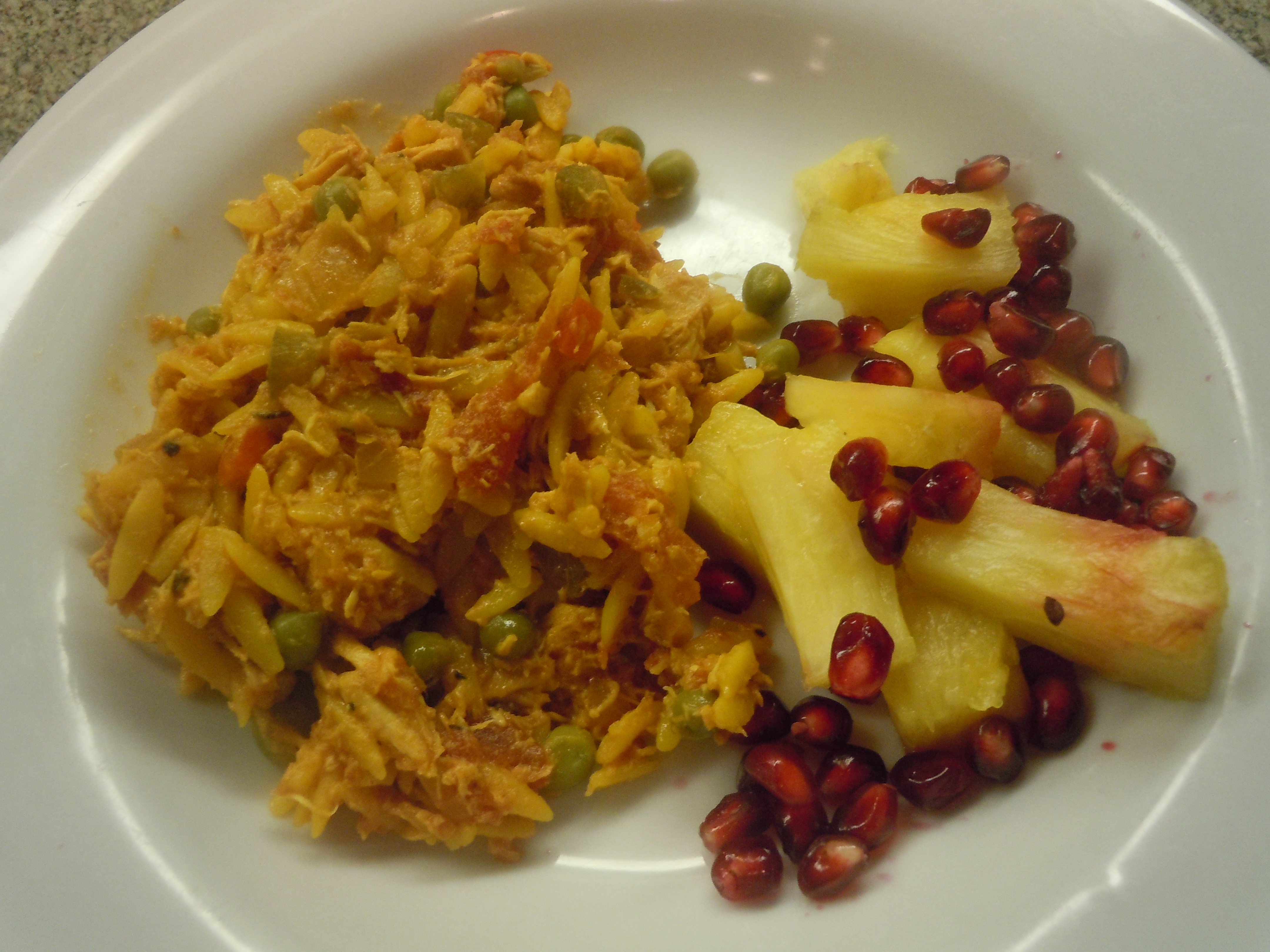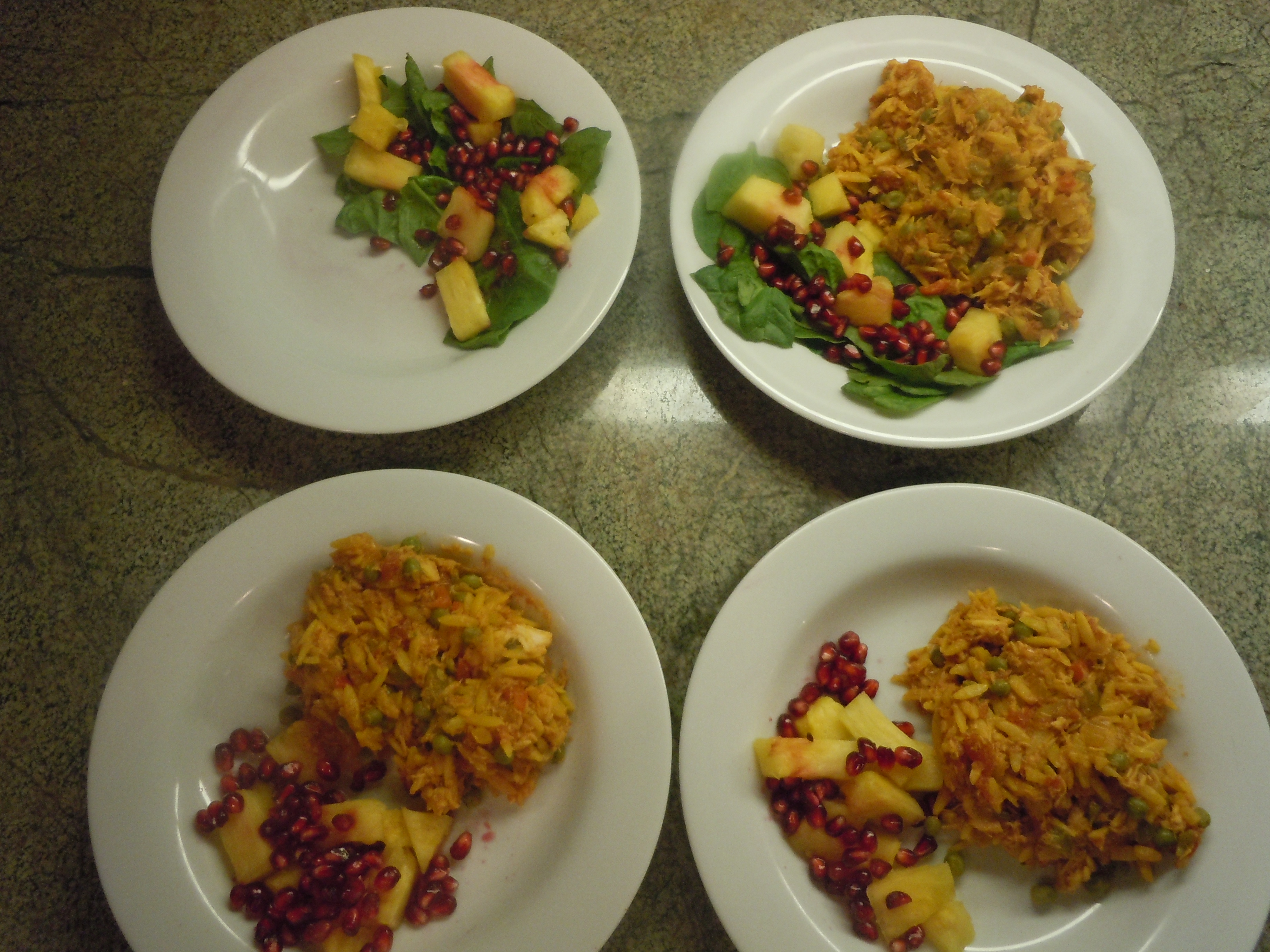 Time to get dinner on.  Instead of sliced apples as I originally thought, I remembered I had cut up pineapple in the refrigerator.  I made a small spinach salad for my husband and I, topped with pineapple and pomegranate seeds, and served just the pineapple and pomegranate seeds to the kids – a small consolation for the instant replay meal…