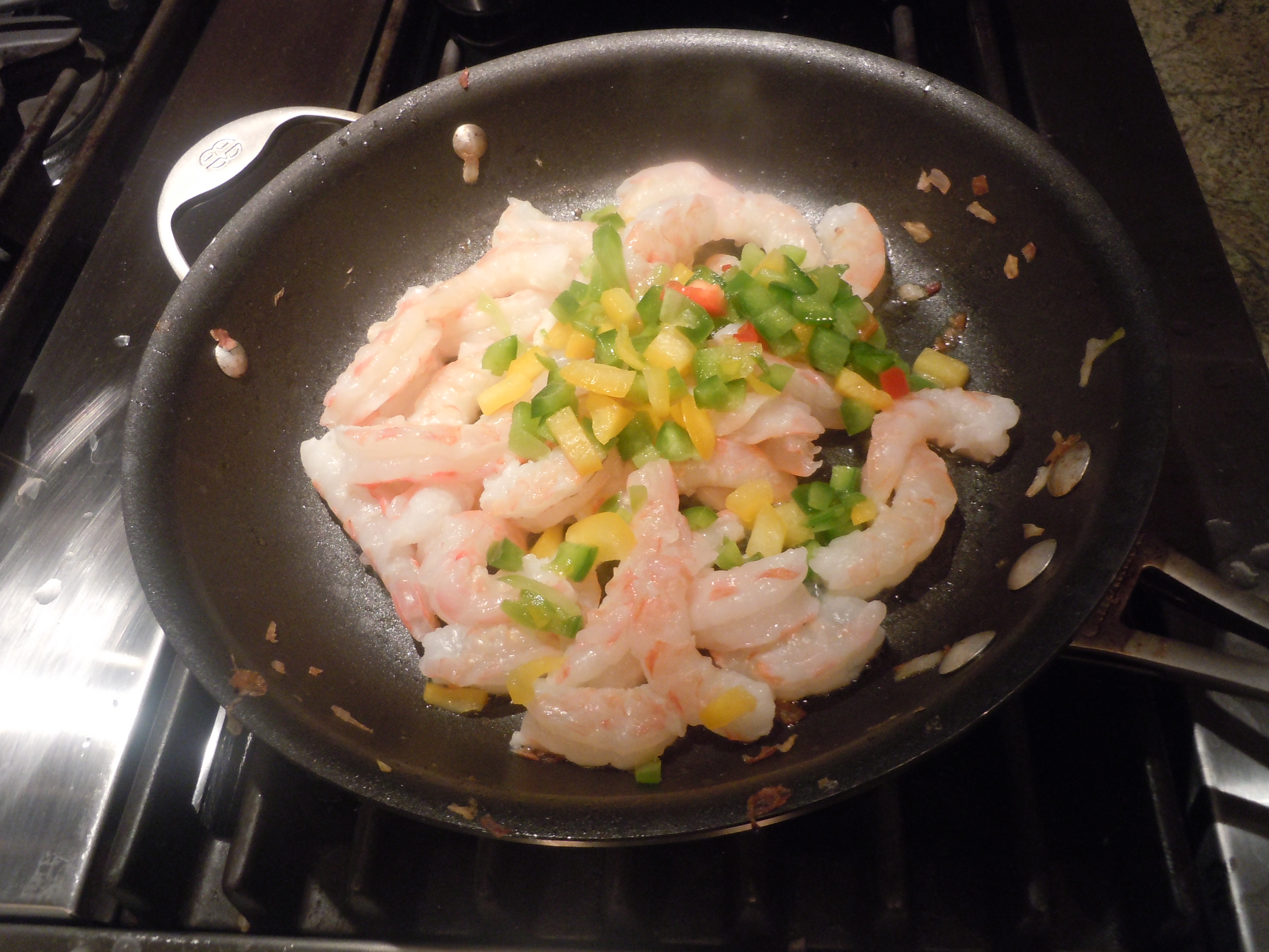4.  Saute onion until soft and clear.  Set aside. Cook shrimp in same skillet with a bit of olive oil.  If you have any other vegetables you want to finish up, feel free to add.  I added some left over diced bell pepper.