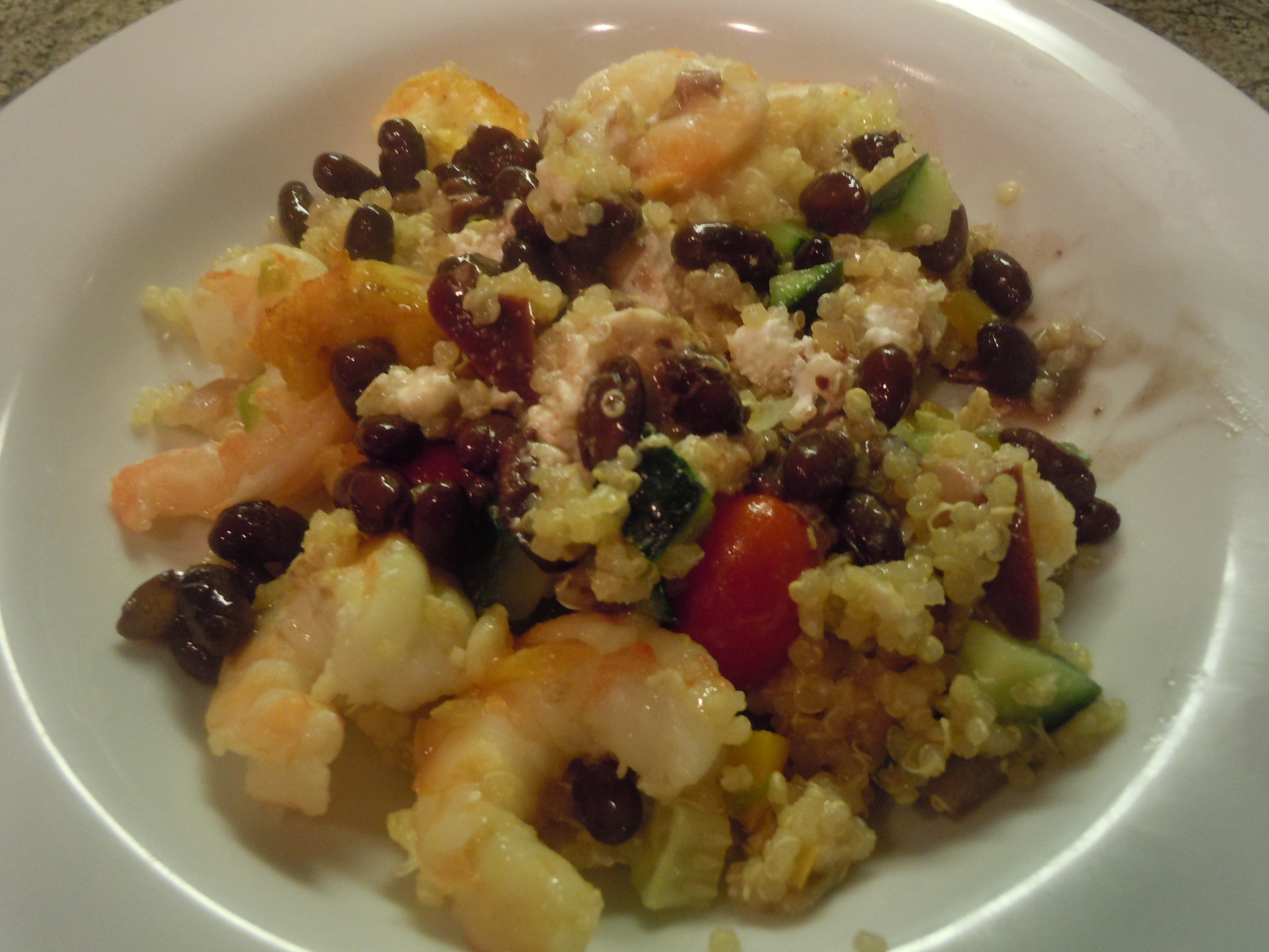 5. Once shrimp turns pink (3-4 minutes), it is time to put dinner together.  Mix lemon-olive oil mixture into quinoa.  Add cucumber, feta, olives, cherry tomatoes and black beans.  Mix well.  Then add shrimp and serve! (If this is the second meal, add the chicken and serve!)