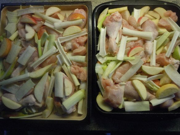 Moments from putting the Roasted Chicken, Apples, Pears, and Leeks in the oven