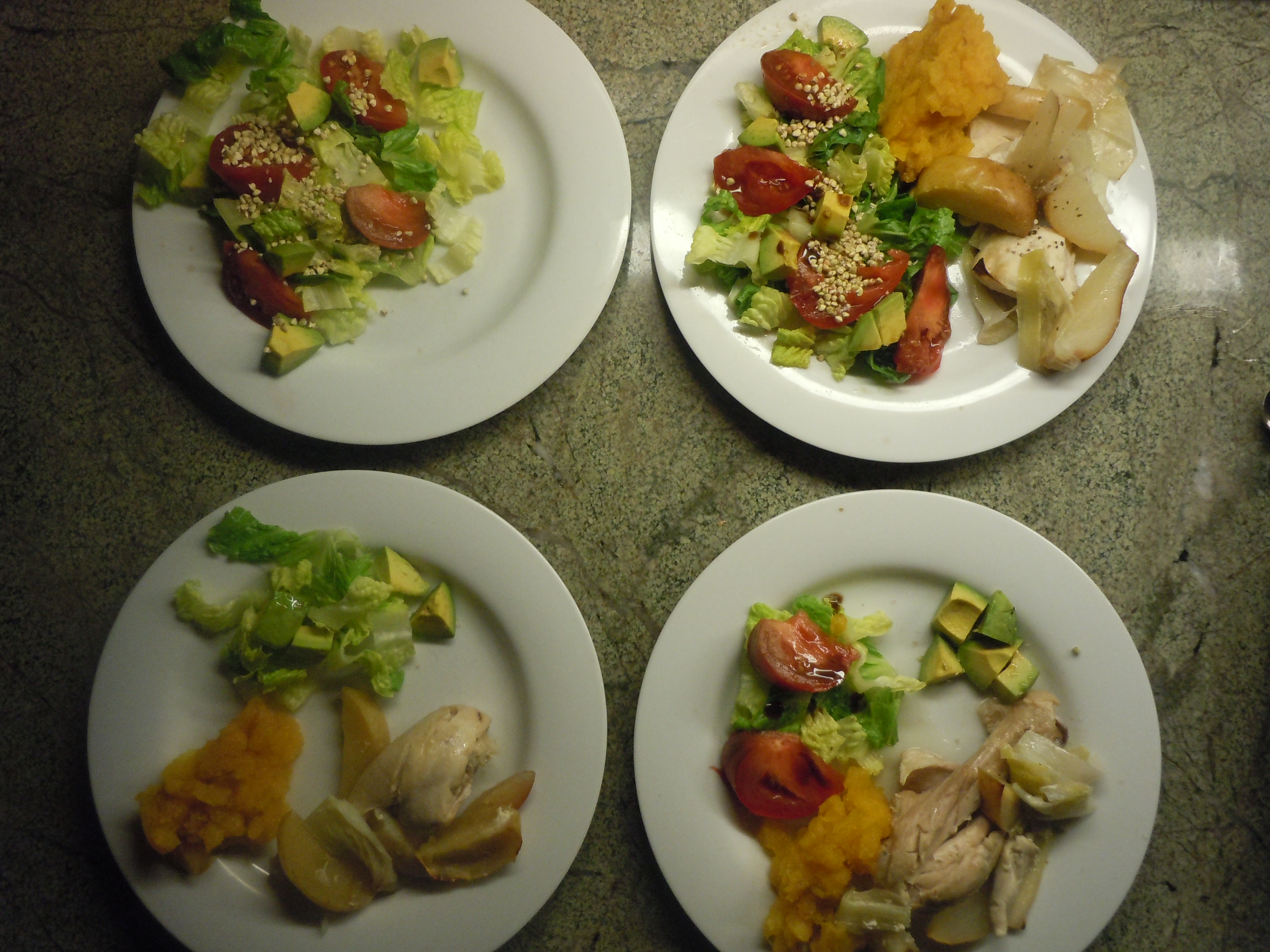 5. While chicken is cooking prepare a side salad with salad toppings and low fat salad dressing, and prepare the pumpkin.