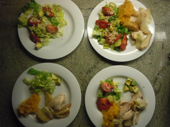 While I was waiting for the chicken, I made a side salad with tomatoes and avocado, and lightly drizzled no oil salad dressing.  For my husband and I also sprinkled some raw granola and sprayed a bit of Bragg’s Liquid Aminos. Then I got one container of pumpkin out of the fridge.