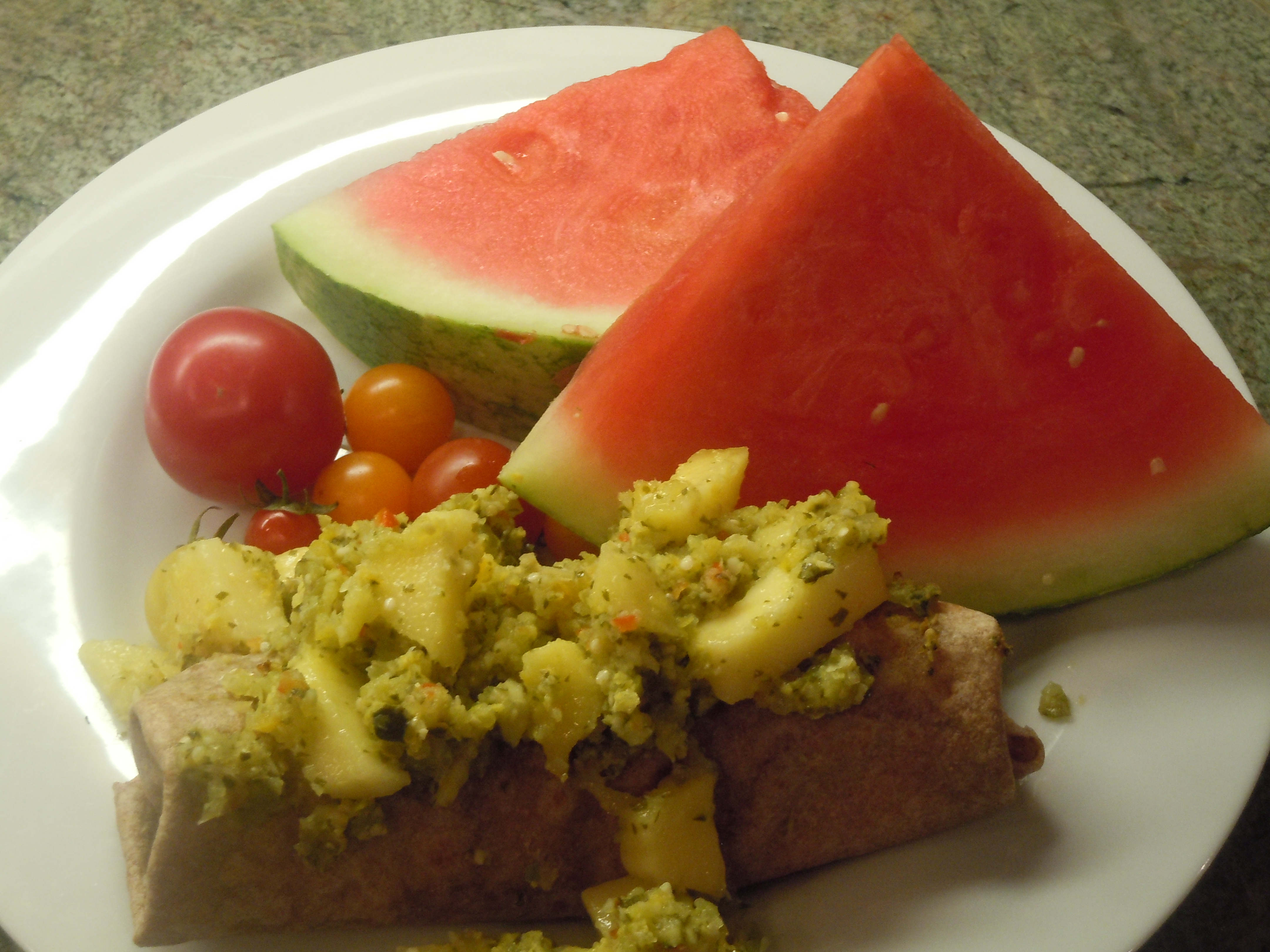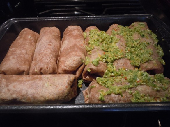 And the pumpkin?  I totally forgot about it warming in the microwave.  Oh well, everyone was quite satisfied with their dinner – one burrito each and some fruit was more than enough.  Pumpkin is on the menu for Thursday night!