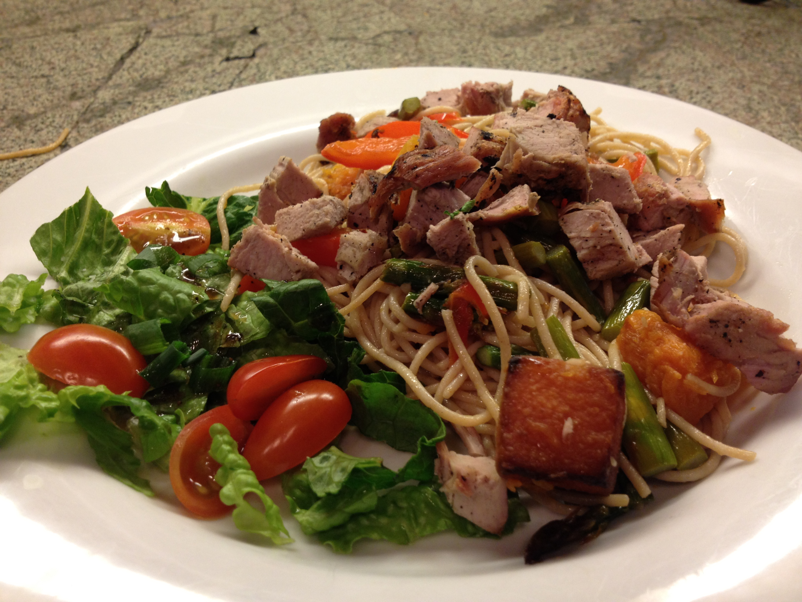 Wednesday: Squash with Kidney Beans, Feta, Leftover Grilled Vegetables and Pasta Sauce