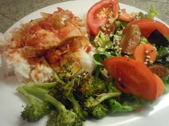 - While salmon is cooking, portion greens and make a side salad.