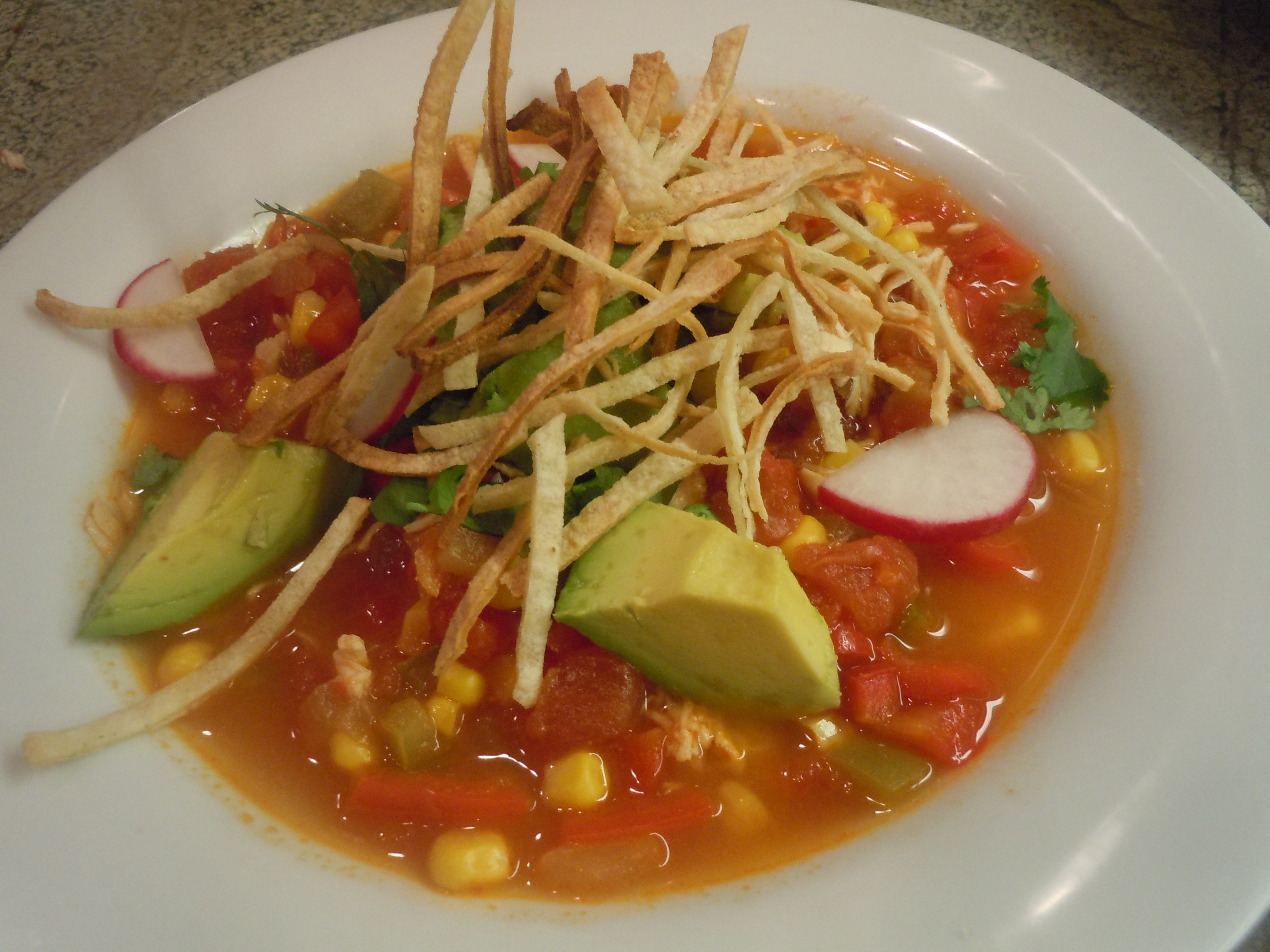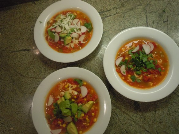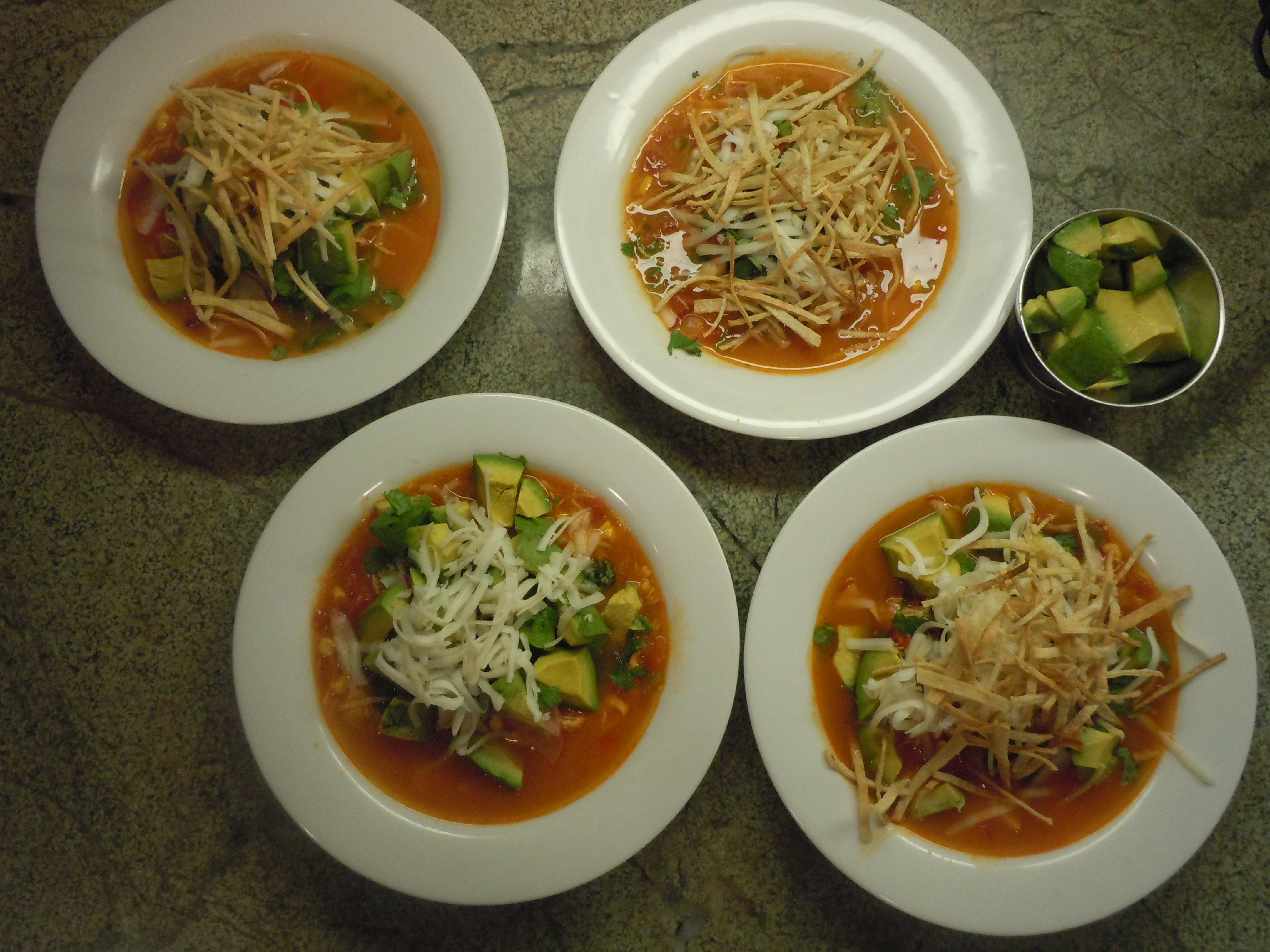 I cut and portioned an avocado across the four bowls, ladled soup in each bowl, sprinkled some cheese and tortilla strips and served! Ace!